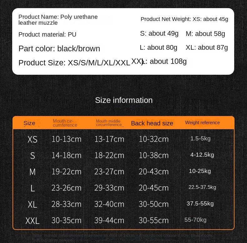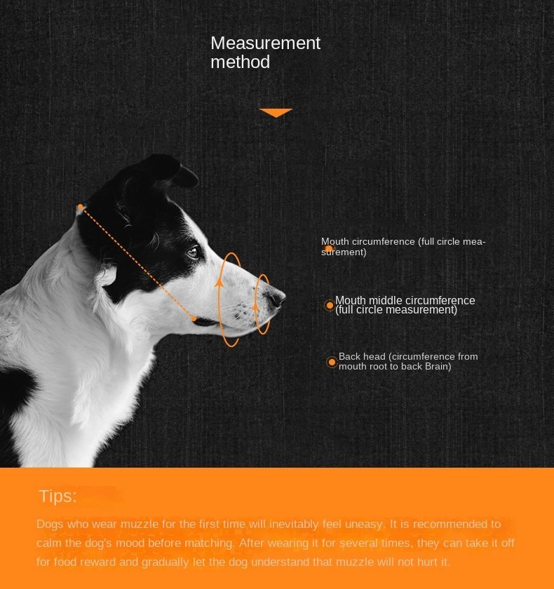 Use a soft ruler to measure the circumference of the pet mouth (the circumference of the middle of the mouth) does not need to be too tight; can be put in a finger is appropriate; according to the mouth circumference of the nearest size of the muzzle.